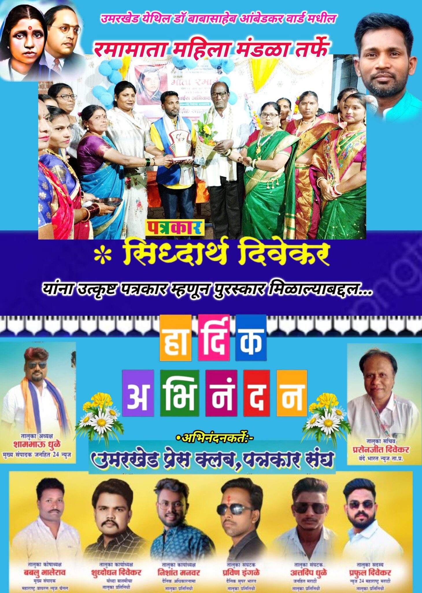 फुलंब्री औरंगाबाद प्रतिनिधी अकबर शहा,अनिल कळंके, नाशिक विशेष प्रतिनिधी आनंद दाभाडे,एडिटर विभागाचे युवराज हंगेकर केळापूर यवतमाळ प्रतिनिधी हनुमान लसंते इत्यादी मान्यवरांच्या उपस्थित पुरस्कार प्रदान करण्यात आला.