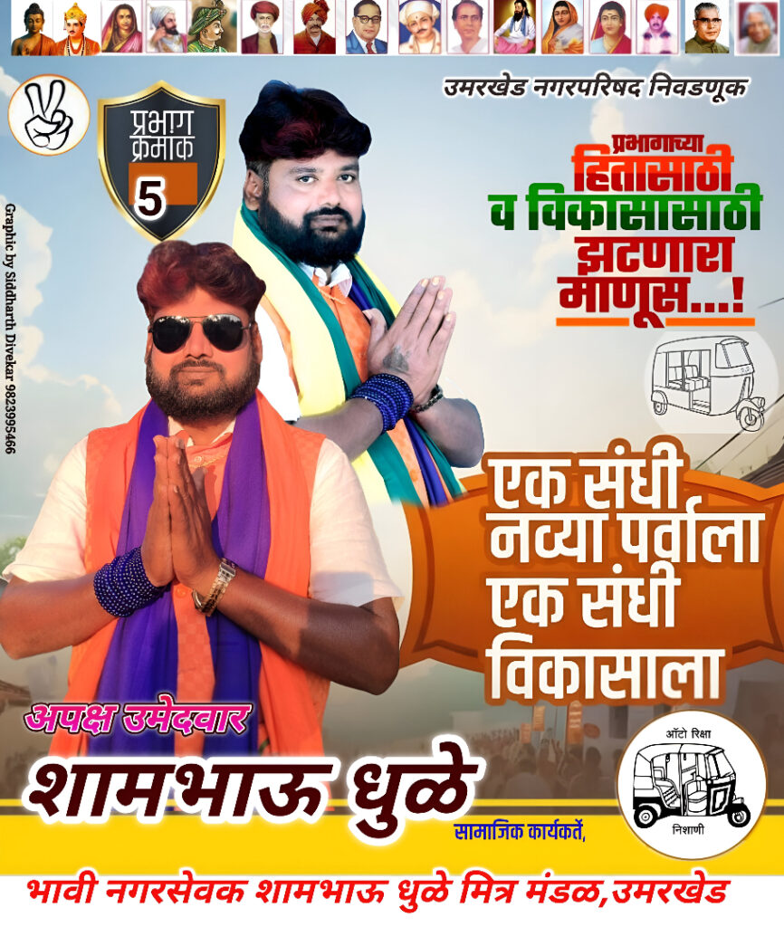 चौकट – शामभाऊ धुळे त्यांच्या प्रतिस्पर्धी म्हणून जनशक्ती पॅनलचे विरेंद्र खंदारे, भारतीय जनता पार्टीच्या सौ. सविता पाचकोर, सचिन आठवले शिवसेना, सुरेश डोंगरे वंचित बहुजन आघाडी, माधव किसन धुळे अपक्ष, अविनाश सोनून रिपब्लिकन सेना इत्यादी उमेदवार रिंगणात आहेत. पण यावर सर्वात भारी पडणार केवळ एकाच वाघ शामभाऊ धुळे हेच या इंदिरा गांधी वार्ड व प्रभाग क्रमांक ४ ची आन-बान-शान आहेत अशी प्रतिक्रिया जागृत व सुज्ञ मतदारांनी दिली.